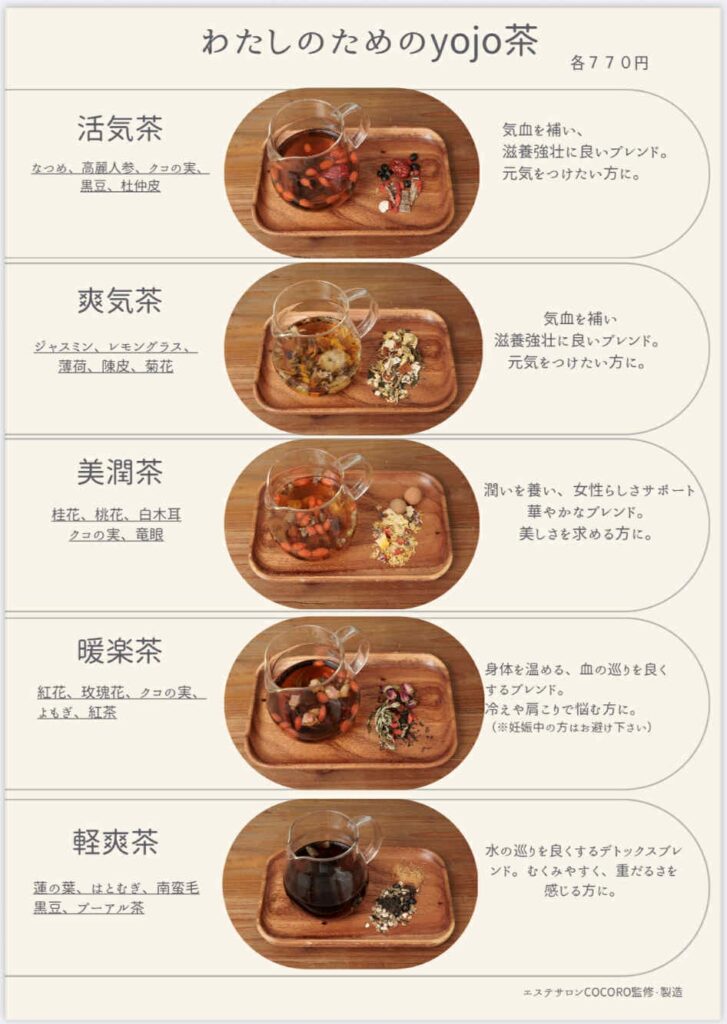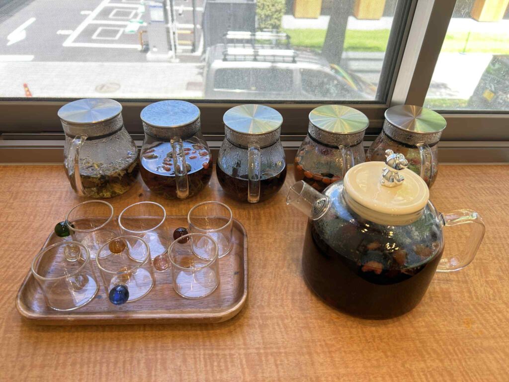 薬膳茶は、体質別に作られた5種類の定番茶や季節のお茶からお選びいただけます。